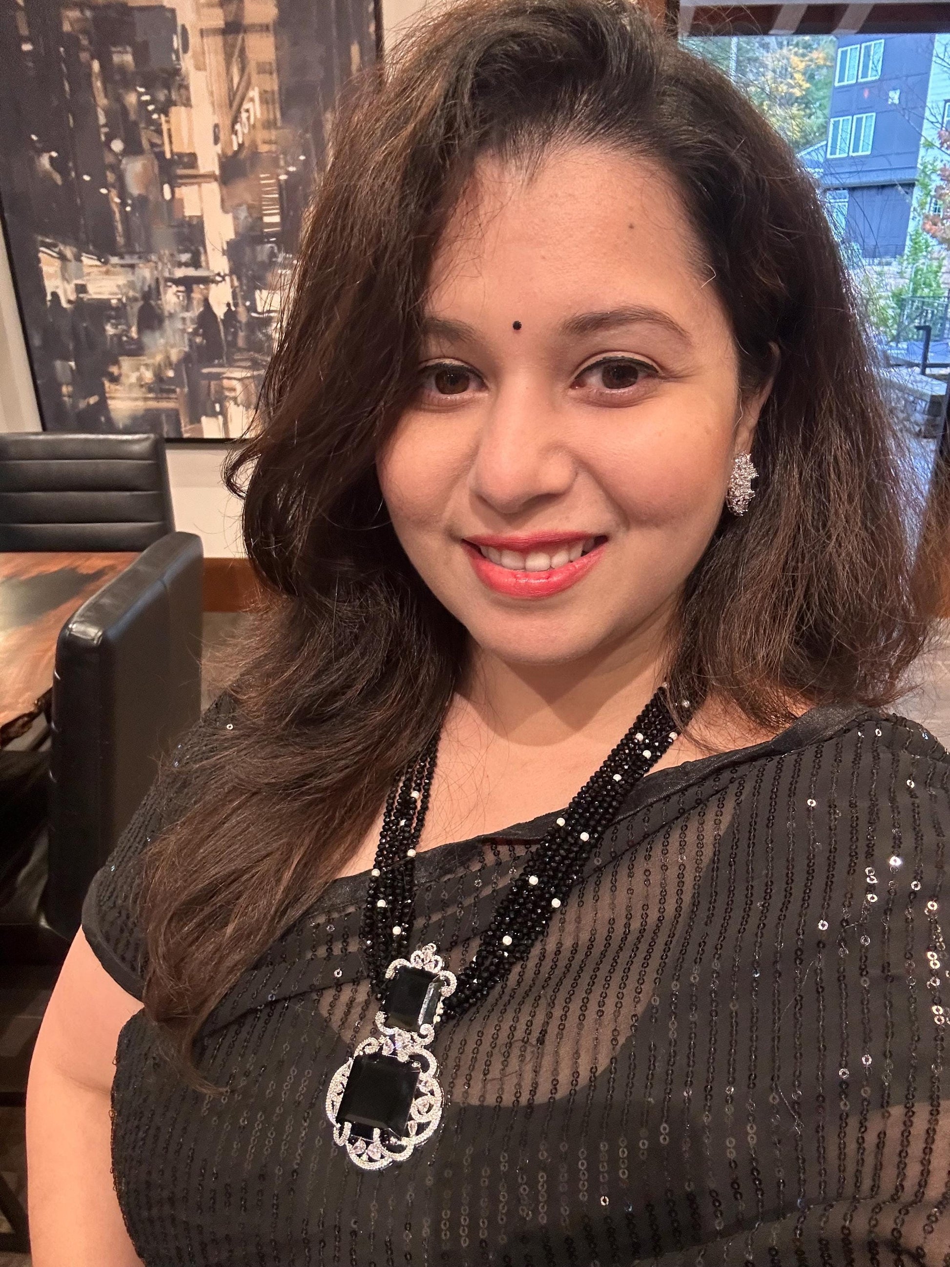Black beads necklace set long, Doublet stone pendant with American diamonds zirconia silver polished. Bollywood style. Nita Ambani necklace inspired.