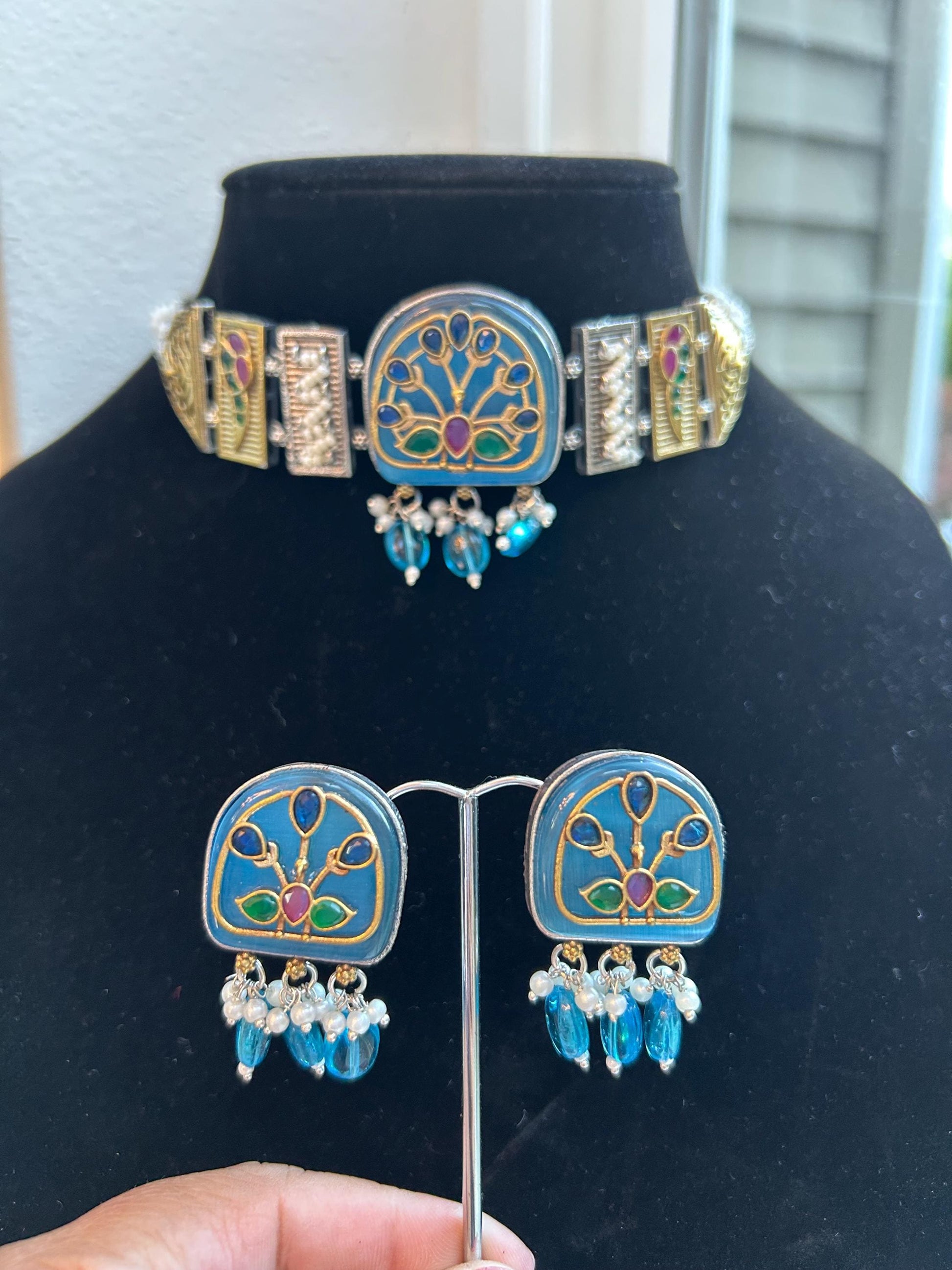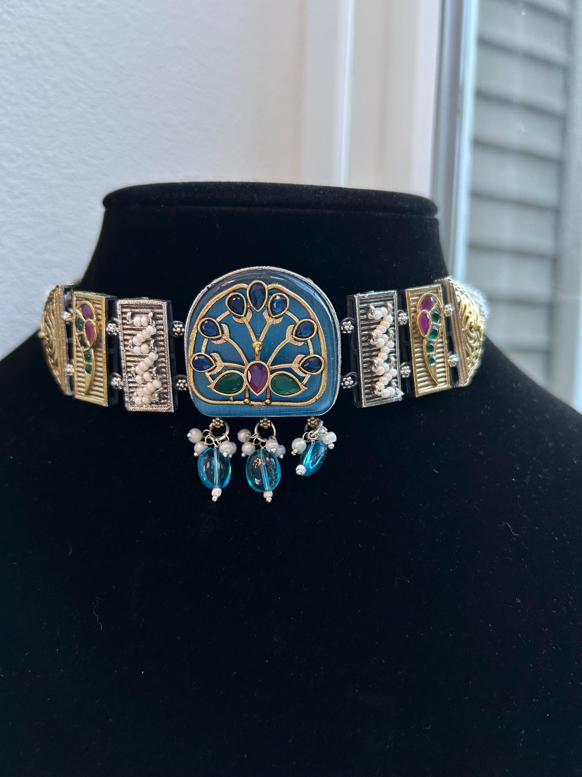 German silver, fusion jewelry silver oxidized polished necklace set with stones and diamonds