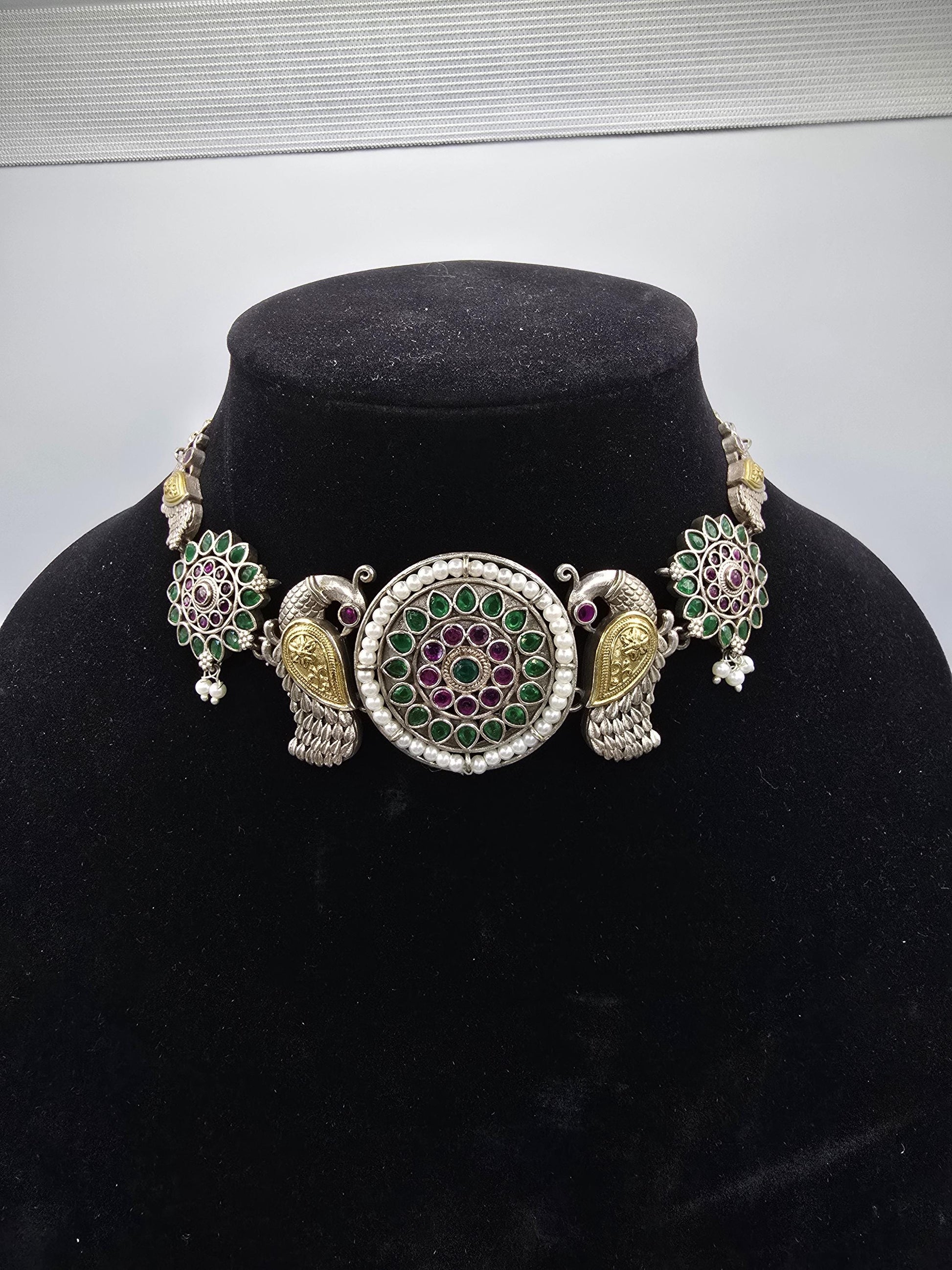 German silver, fusion jewelry silver oxidized polished necklace set with stones and diamonds