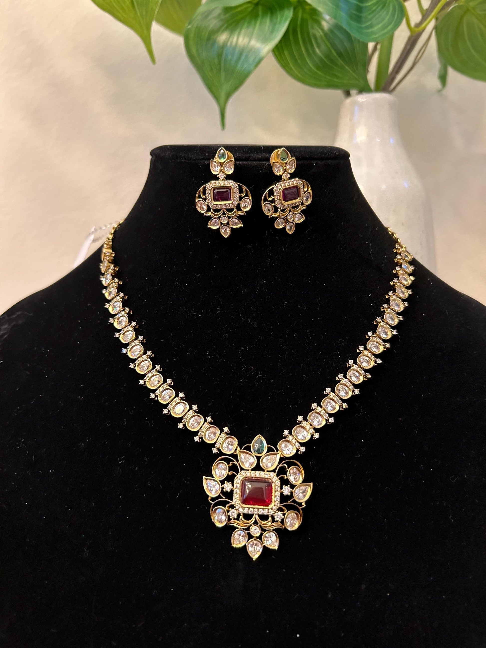 Polki and American diamonds necklace set, adjustable antique gold polished